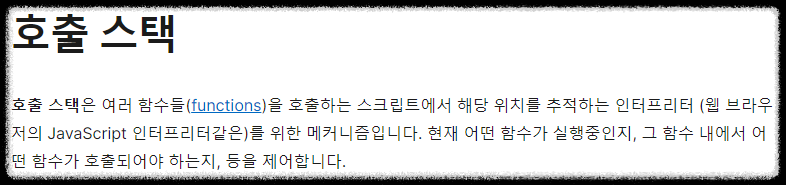 4. 해당 함수 안에서 호출되는 모든 함수를 콜 스택에 추가 5. 스택 구조(후입선출)로 가장 상위의 함수부터 실행하기 시작 6. 현재 함수가 끝나면, 인터프리터는 스택을 제거 7. 호출 스택 마지막 코드 목록에서 중단된 실행을 다시 시작 8. 스택이 할당된 공간보다 많은 공간을 차지하면, "stack overflow" 에러가 발생