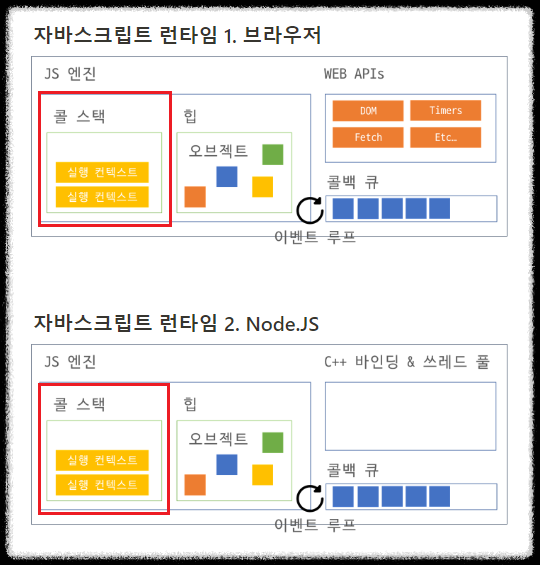 ※ 호출 스택(콜 스택) 동작 원리 1. 전역 실행컨텍스트 최초 실행 2. 스크립트에서 특정 함수를 호출 3. 인터프리터는 해당 함수를 콜 스택에 추가