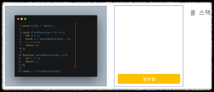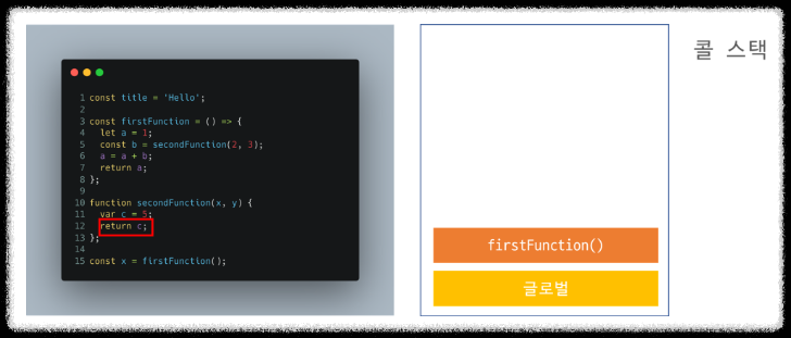 firstFunction()이 return과 동시에 콜 스택에서 빠짐 모든 코드의 실행이 끝나면서 전역 실행컨텍스트도 콜 스택에서 빠짐