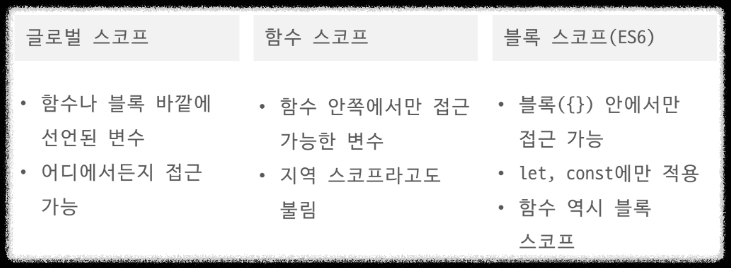 - 특정 변수나 함수의 스코프는 해당 변수, 함수를 참조할 수 있는 범위를 뜻한다.