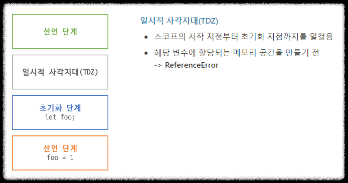- let, const : 선언부만 호이스팅이 일어나고 별도의 초기화 과정이 없기때문에 개발자가 초기화해준 구간까지 TDZ (일시적 사각지대) 구간이 발생한다.