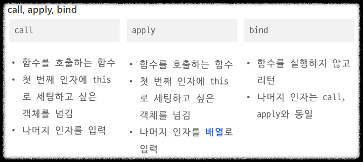 - 객체 + 객체 내부의 함수 표현식 : 브라우저( 표현식을 감싸고 있는 객체 ) / NodeJS(표현식을 감싸고 있는 객체) - 객체 + 객체 내부의 화살표 함수 : 브라우저(window) / NodeJS({}) - 이벤트 리스너 + 함수 선언식 : 이벤트가 일어난 HTML 요소 - 이벤트 리스너 + 함수 표현식 : window - new 연산자 (객체 생성) : 생성된 객체에 바인딩