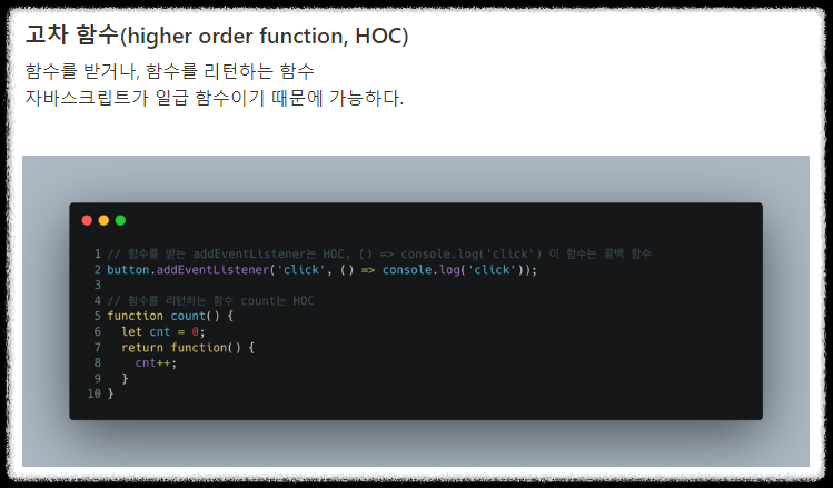 - 다른 함수를 조작하는 함수로써 함수를 파라미터로 전달받거나 return을 사용해 함수를 반환해주는 함수이다.