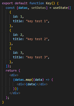 ※ 이유 - key props는 React가 어떤 항목을 추가, 제거, 변경 할지 식별할 수 있는것을 돕는다. (고유성 부여) - key props를 부여하지 않을 경우 React는 어떤 항목이 추가, 제거, 변경되었는지 식별하는데 어려움을 겪게 되고, 이로인해 불필요한 리렌더링이 일어날 수 있다. map을 사용해 배열 반복