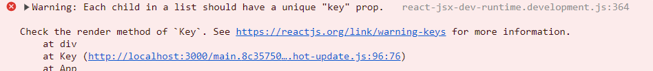 key를 선언해주지 않아서 생기는 에러 ※ 선택 조건 - default : key props를 명시해주지 않을 경우 index값을 사용한다. - 추천 : DB의 primary key와 같이 해당 아이템의 고유한 id값으로 지정해주는것이 좋다.