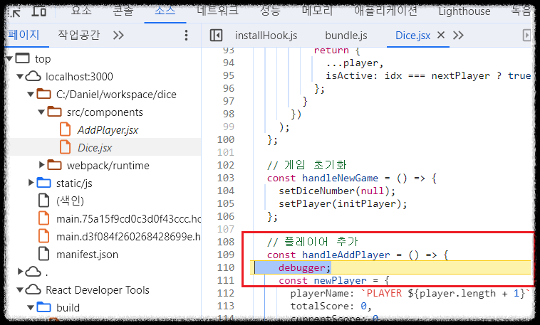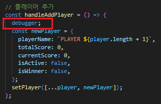 - 문제의 원인으로 추정되는 함수에 debugger 코드 작성