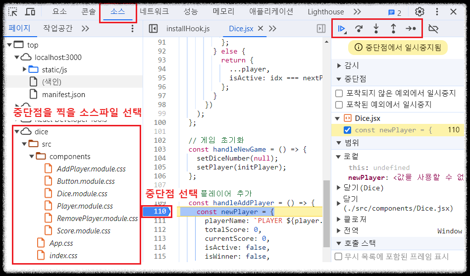 중단점 (break points) 찍기