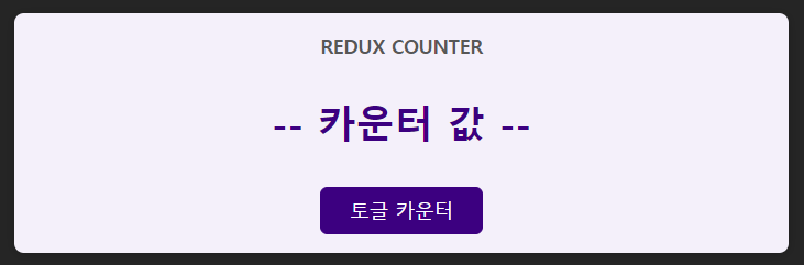 - Counter.jsimport classes from './Counter.module.css'; const Counter = () => { const toggleCounterHandler = () => {}; return ( <main className={classes.counter}> <h1>Redux Counter</h1> <div className={classes.value}>-- 카운터 값 --</div> <button onClick={toggleCounterHandler}>토글 카운터</button> </main> ); }; export default Counter;