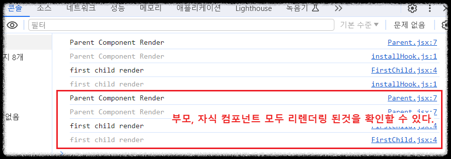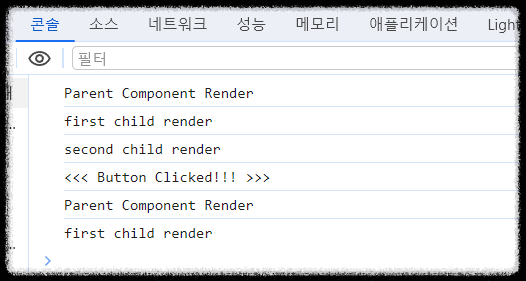 - 결론 : useState로 선언한 상태값만 변경이 되고 UI는 동일하지만, Parent, FirstChild 컴포넌트가 리렌더링이 진행된것을 확인할 수 있다.