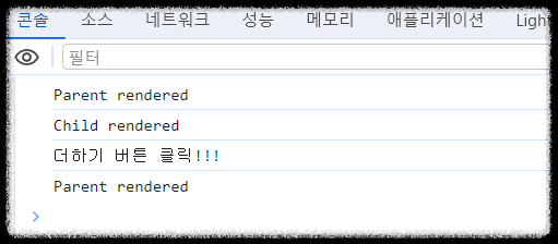 - 결론 :버튼을 클릭하였지만,useState로 선언한 상태값과 UI 변경이 없었기때문에 별도의 컴포넌트 리렌더링이 일어나지 않은 것을 확인할 수 있다.
